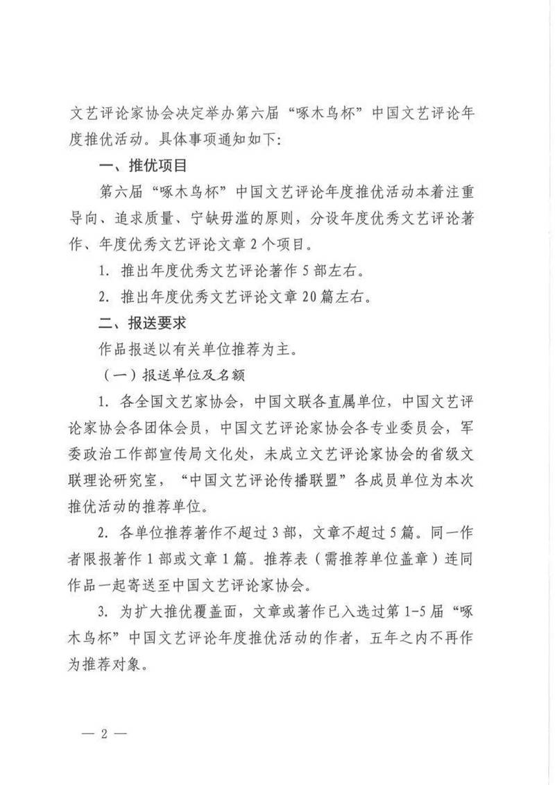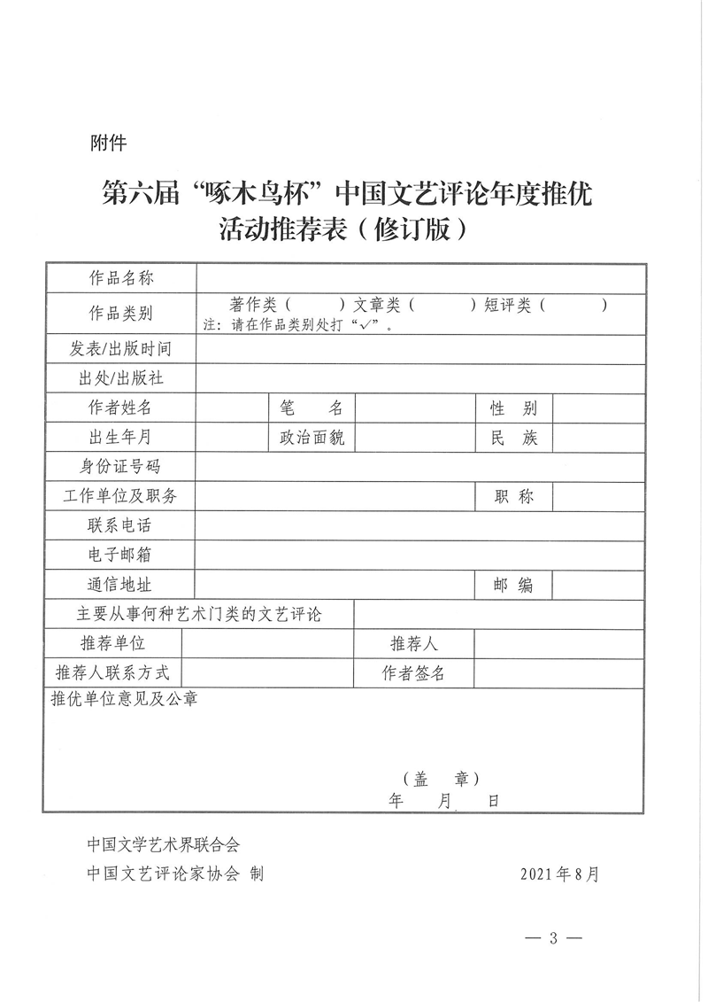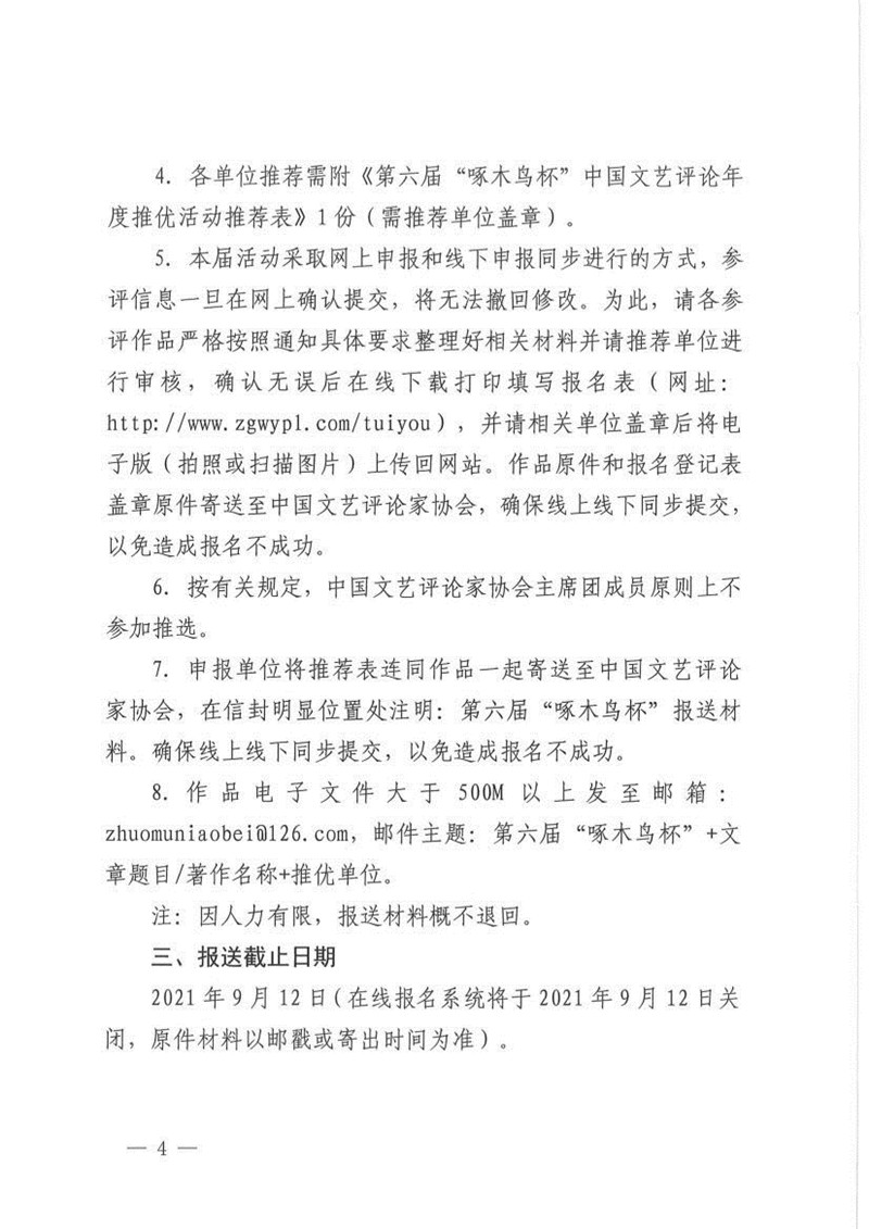 全市文艺评论工作者: 根据《中国文联办公厅关于举办第六届"啄木鸟杯"中国文艺评论年度推优活动的通知》和《中国文联办公厅关于举办第六届"啄木鸟杯"中国文艺评论年度推优活动的补充通知》,我市报送著作不超过3部,文章不超过5篇,文艺短评文章不超过5篇,请有意通过我会推荐申报的文艺评论作者认真阅读中国文联办公厅发布的通知和补充通知,于2021年9月3日前将作品寄至我会。 附件下载方式:请复制下面网页至浏览器 http://www.zgwypl.com/show-379-48441-1.html 一、报送截止日期 截止日期:2021年9月3日(以邮戳为准) 相关材料邮寄至:天津市和平区新华路237号天津市文艺家服务中心,邮编:300040 电子版请发送至邮箱:tjwl70@163.com 二、联系人及联系方式 联系人:慕珊珊 联系方式:022-23392089