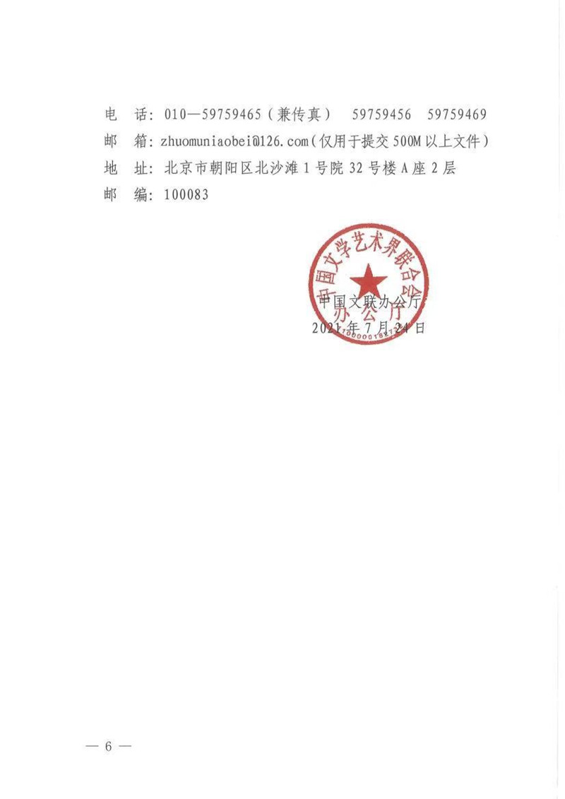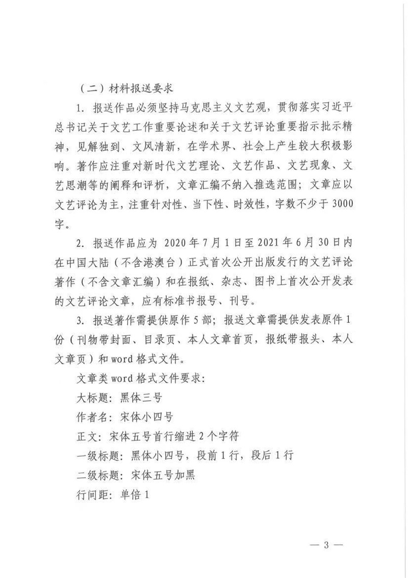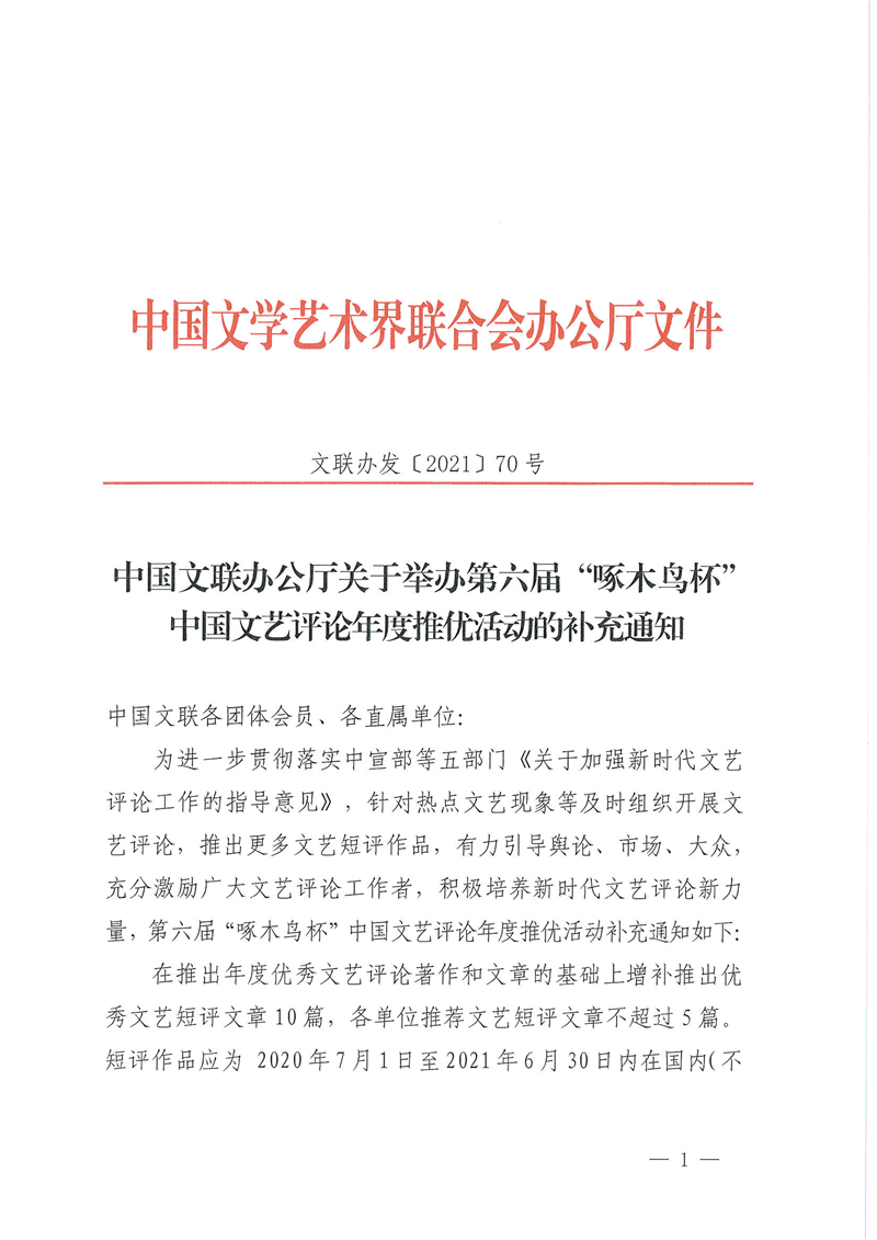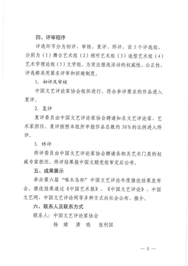 全市文艺评论工作者: 根据《中国文联办公厅关于举办第六届"啄木鸟杯"中国文艺评论年度推优活动的通知》和《中国文联办公厅关于举办第六届"啄木鸟杯"中国文艺评论年度推优活动的补充通知》,我市报送著作不超过3部,文章不超过5篇,文艺短评文章不超过5篇,请有意通过我会推荐申报的文艺评论作者认真阅读中国文联办公厅发布的通知和补充通知,于2021年9月3日前将作品寄至我会。 附件下载方式:请复制下面网页至浏览器 http://www.zgwypl.com/show-379-48441-1.html 一、报送截止日期 截止日期:2021年9月3日(以邮戳为准) 相关材料邮寄至:天津市和平区新华路237号天津市文艺家服务中心,邮编:300040 电子版请发送至邮箱:tjwl70@163.com 二、联系人及联系方式 联系人:慕珊珊 联系方式:022-23392089