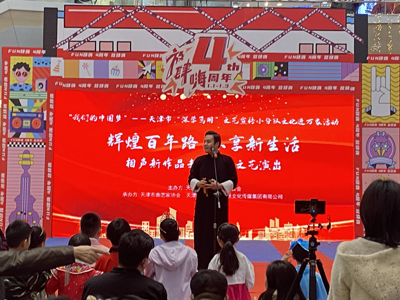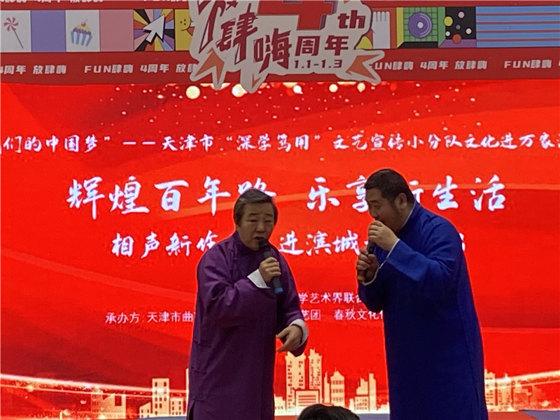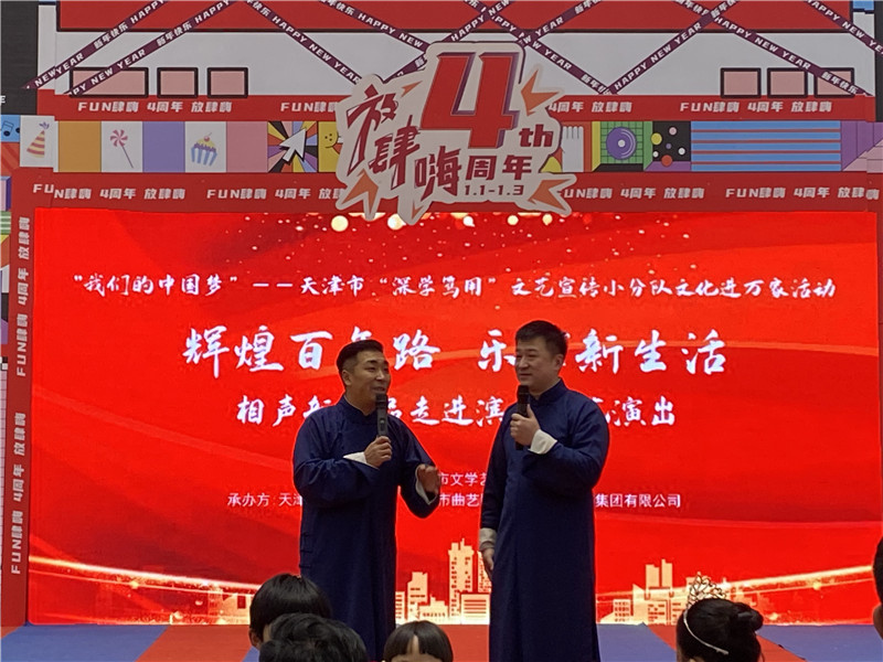 2022年1月3日下午,由5630福彩网主办,天津市曲艺家协会、天津市曲艺团、春秋文化传媒集团有限公司联合承办的我们的中国梦——天津市“深学笃用”文艺宣传小分队文化进万家活动“辉煌百年路 乐享新生活”相声新作品走进滨城文艺演出在滨海新区举行。