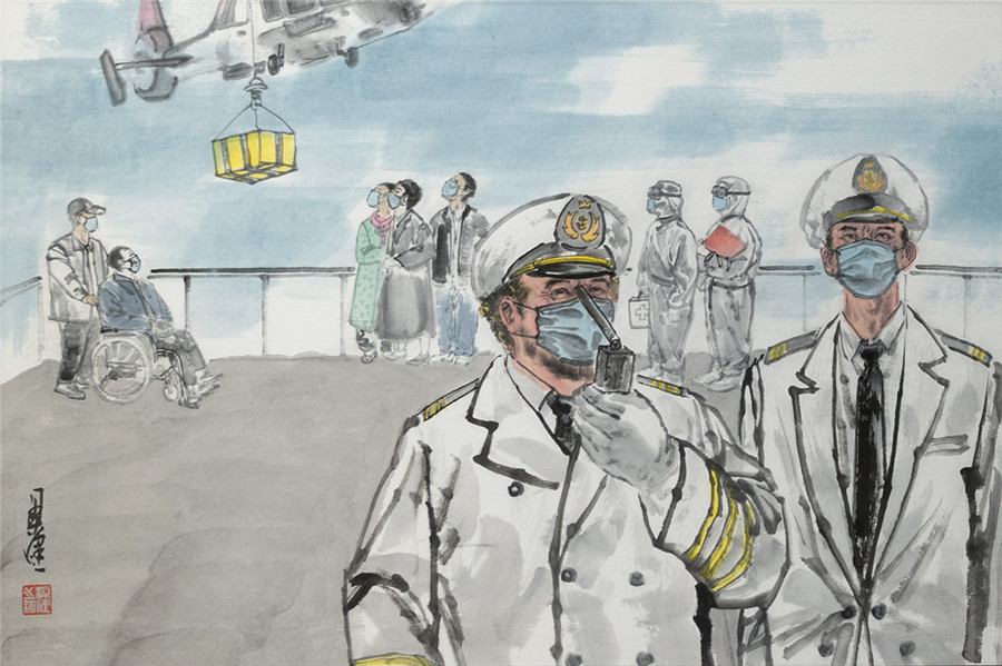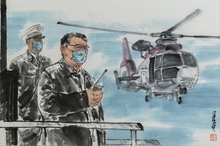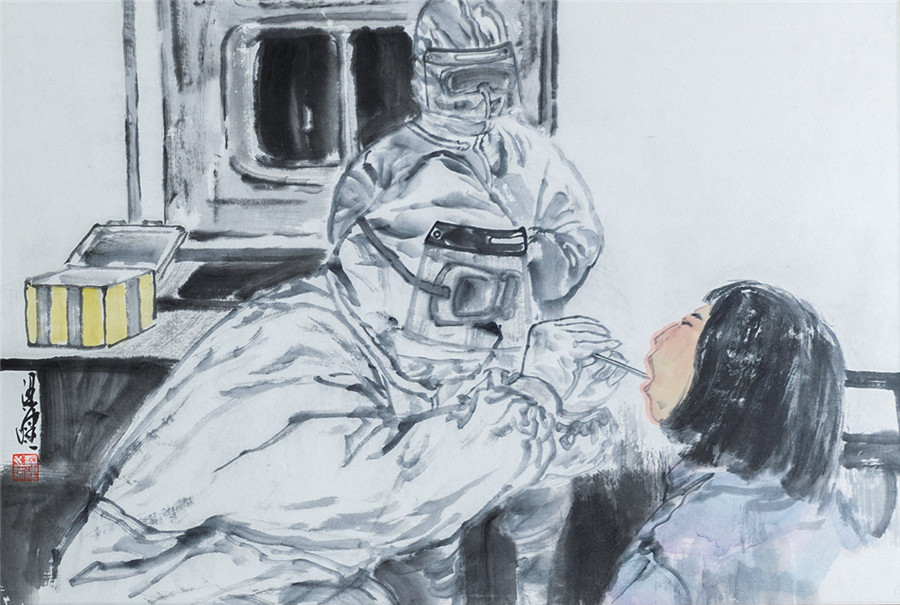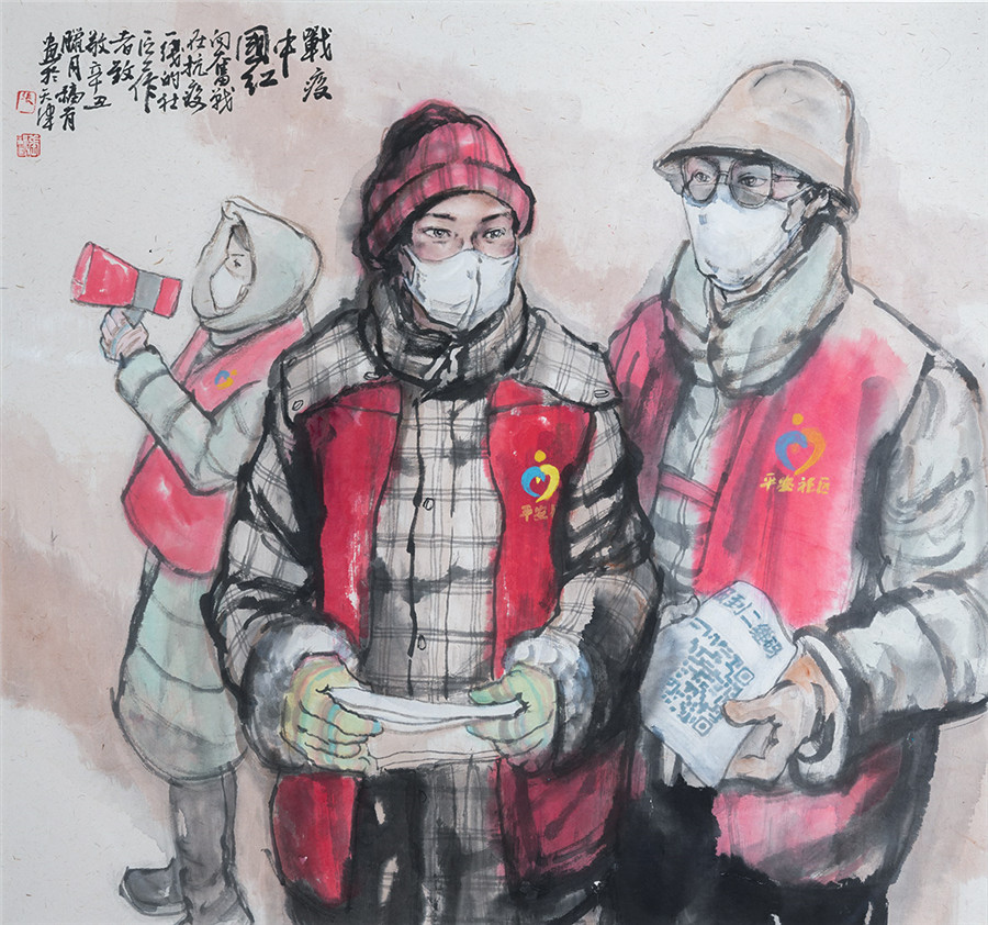国画《“战疫”中国红》张福有