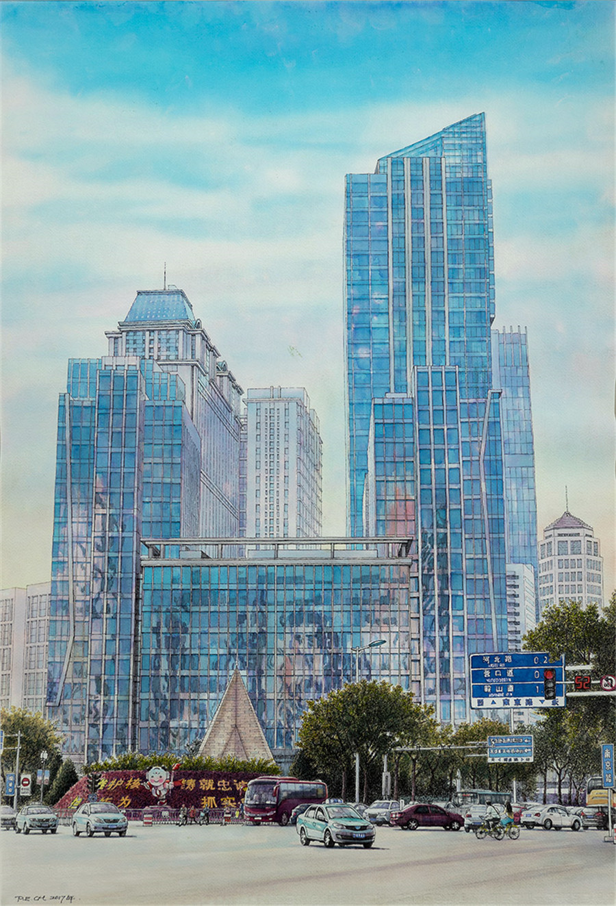钢笔水彩画 《津城新貌之二》 庞恩昌