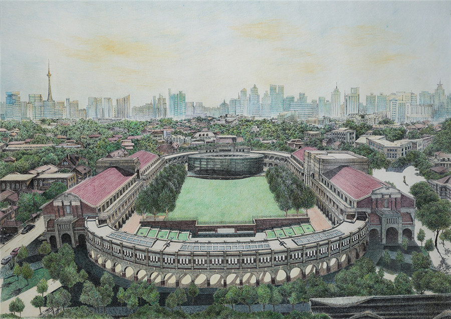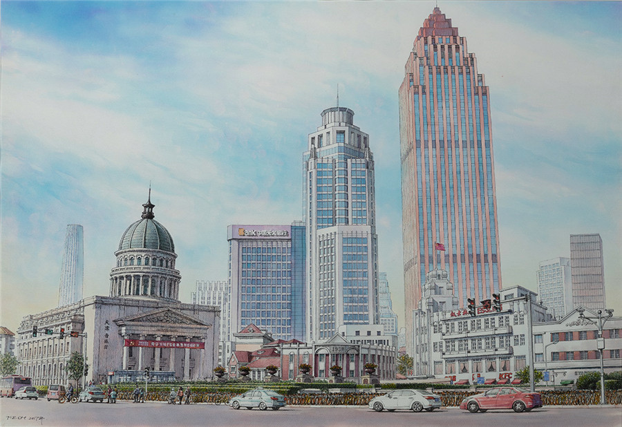 钢笔水彩画 《津城新貌之一》 庞恩昌