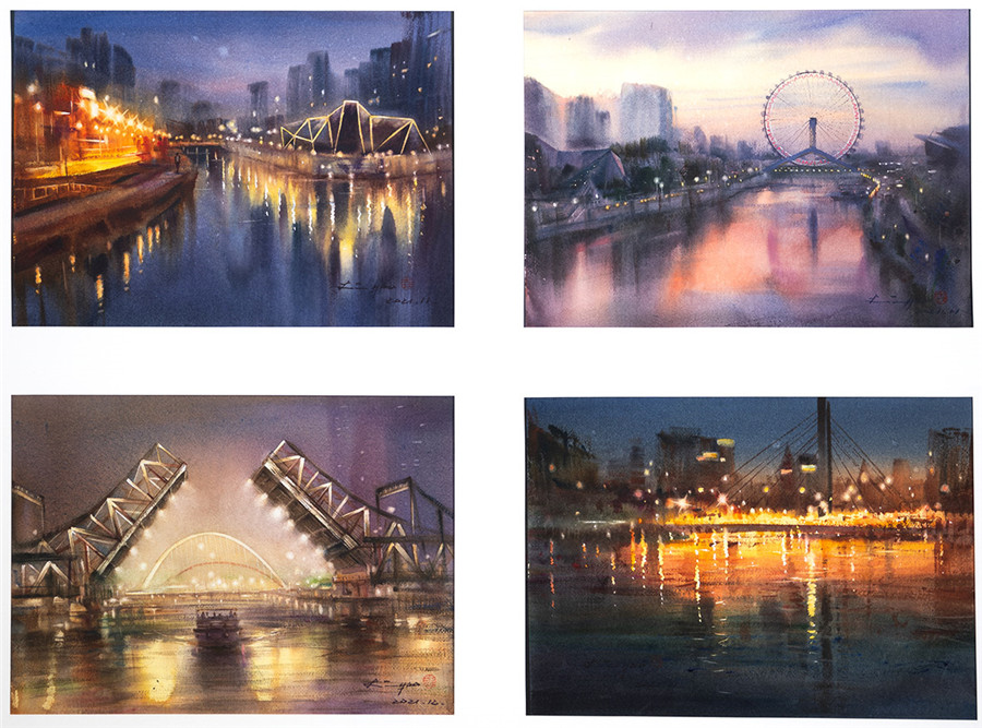 水彩 《海河之夜》李