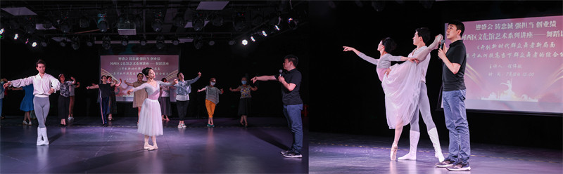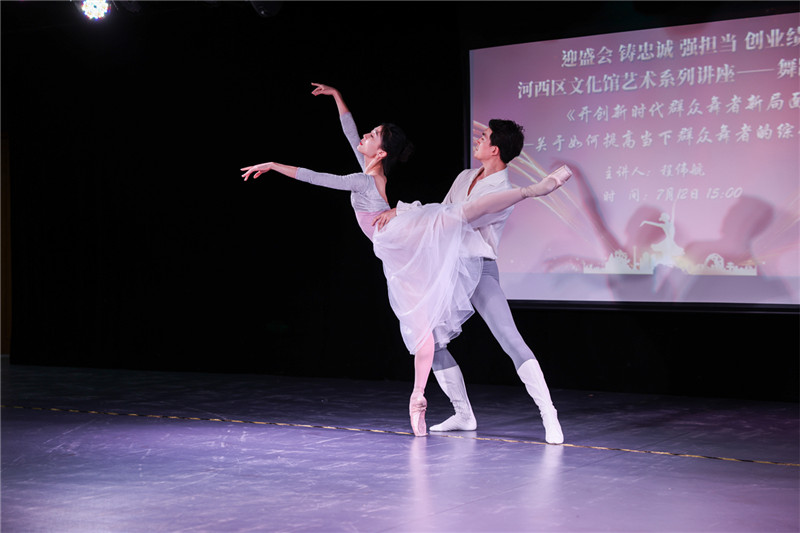 这次艺术讲座采用理论讲解与现场互动相结合的方式,为大家解读了群众舞蹈的意义、分析了群众舞蹈的现状,就群众舞蹈的发展方向以及群众舞蹈在群文中的作用进行了深刻剖析。活动中,天津歌舞剧院芭蕾舞团首席演员张为璐和袁帅现场为大家进行舞蹈基本形态互动实践教学。他们优雅舒展的舞姿,让大家近距体会到芭蕾的魅力。讲座期间还增设了市第十二次党代会知识问答环节,在学习舞蹈的同时,也让市十二次党代会精神深入人心。