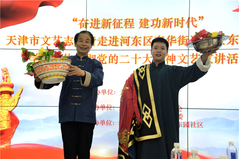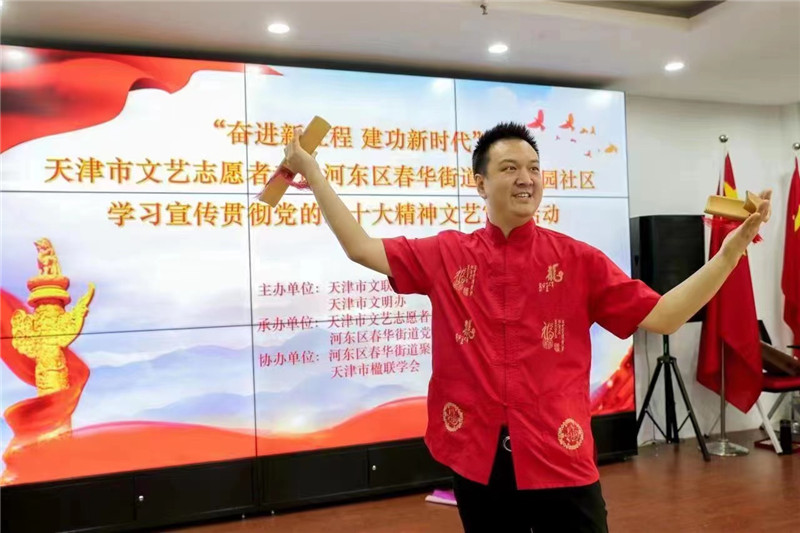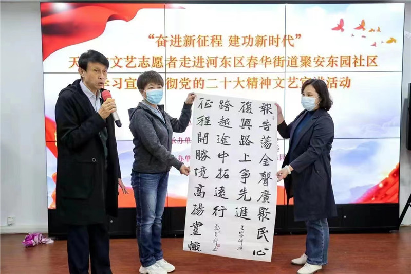 近日,由5630福彩网、天津市文明办联合主办,天津市文艺志愿者协会、河东区春华街工委承办,天津市楹联学会协办的“奋进新征程 建功新时代——天津市文艺志愿者学习宣传贯彻党的二十大精神走进河东区春华街道聚安东园社区”文艺宣讲及颁证授牌成功举办。 此项活动旨在把全市广大党员干部群众的思想和行动统一到党的二十大精神上来,把智慧和力量凝聚到落实党的二十大确定的各项任务上来。按照市文联统一部署,我会迅速行动,充分发挥文艺志愿服务宣传、教育、引导群众的独特作用和优势,积极组织全市文艺界用文艺的形式通过创新宣传形式和手段,开展百姓喜闻乐见的文艺活动,推动党的二十大精神进机关、进企事业单位、进城乡社区、进校园、进军营、进各类新经济组织和新社会组织、进网站,把党的二十大精神讲清楚、讲明白,让群众听得懂、能领会、可落实。把党的声音传遍津沽大地、深入百姓心间,努力展现我市文艺工作者学习宣传贯彻党的二十大精神的担当作为而特别举办。 活动当日,5630福彩网党组副书记、专职副主席施琪,河东区委常委、区委宣传部部长刘云光、天津市文明办志愿服务处副处长王宏勤,以及5630福彩网,河东区委宣传部、区文明办,天津市文艺志愿者协会有关负责同志,河东区春华街道、聚安东园社区居民代表出席了活动。市文联、市文明办负责同志向最美文艺志愿者获得者籍薇、最美文艺志愿服务社区河东区春华街聚安东园社区颁发荣誉证书及奖牌。 随后,天津市曲艺团雷琴演奏家王瑞英用红色经典曲目为文艺宣讲活动拉开帷幕。国家级非遗传承人肖桂森,荣获全国自强模范、全国学雷锋岗位标兵等荣誉的天津市曲协会员、天津市盲人协会秘书长蔡成所表演的《民间戏法》、古典戏法《金玉满堂》、快板《奋进新时代》等节目引发现场掌声雷动。 活动中,天津市美协秘书长张福有创作的国画《高原奋进图》,天津市书协秘书长杨健君书写的对联“春华秋实精神文明结硕果,聚安百姓文艺志愿谱新篇”分别赠与籍薇和春华街道。中国楹联书画院常务副院长彭英科、副院长王惠民向社区赠送了书画作品。