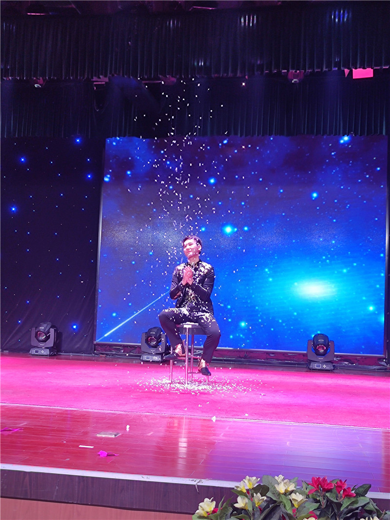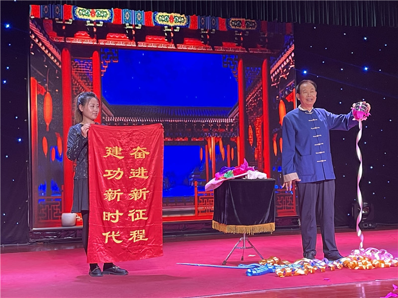 臧元龙表演现代魔术《魔术梦》 观众王女士在台下看得饶有兴致,还参与了魔术互动。王女士高兴地说:“看了这些生动活泼、充满正能量的文艺节目,让人心情愉悦又深感振奋。”