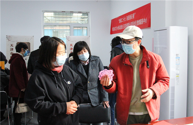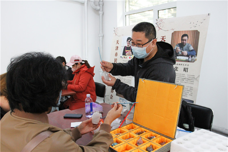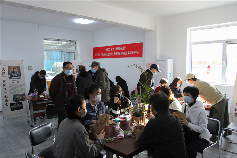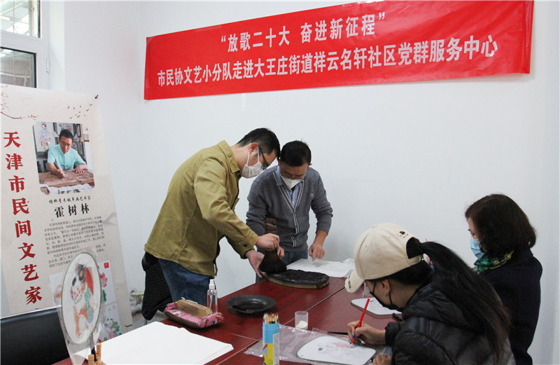 为深入学习宣传贯彻党的二十大精神,丰富群众精神文化生活,助力全市兴起学习宣传贯彻落实党的二十大精神的热潮,11月22日上午,市民协组织艺术家走进大王庄街道祥云名轩社区党群服务中心,开展“放歌二十大 奋进新征程”文艺小分队进基层活动,慰问长期在一线进行防疫工作的社区工作者和志愿者。 活动现场,手绘盘丝艺术家郁从霞、剪纸艺术家赵罡、杨柳青木板年画艺术家霍树林、中式插花艺术家华祥、内画雕刻艺术家张昭,先后为社区工作者、志愿者和居民们展示了丰富多彩的民间艺术作品,介绍和演示传统手工艺的创作过程。艺术家们还准备了材料和工具,悉心指导居民们动手体验制作民间工艺品,充分展示中华优秀传统文化的深厚底蕴和魅力,激发了群众对民间艺术的兴趣,活动现场气氛热烈。