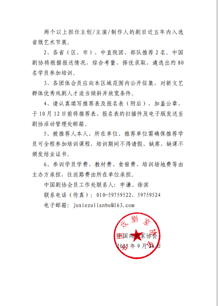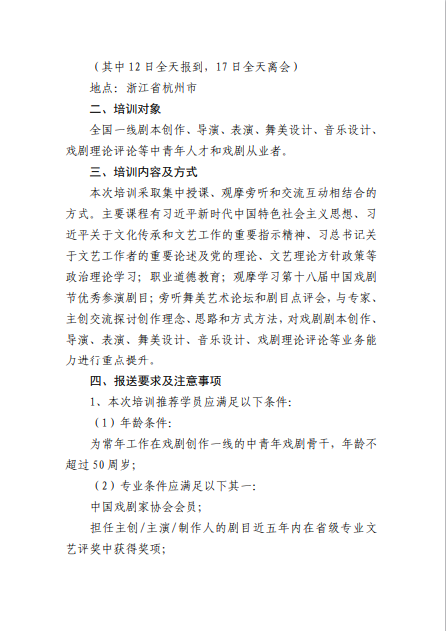现将中国剧协《关于举办中国剧协中青年一线戏剧骨干研习班(杭州)的通知》转发给你们,根据通知中报名条件,请于2023年10月10日前将资料发送至12523804@qq.com。