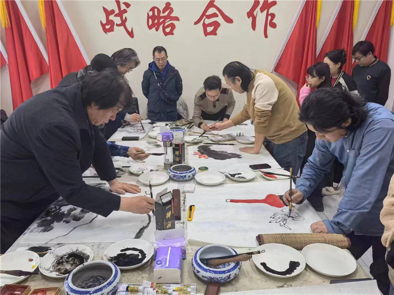 为深入学习贯彻党的二十大精神和习近平文化思想,贯彻落实中央宣传部和市委关于“我们的中国梦 文化进万家”的部署要求,推动中国文联、中央文明办组织开展的“强基工程”在天津落实见效,1月23日,市美术家协会文艺小分队走进天津恒朝国际贸易有限公司,开展“强基工程”——2024“我们的中国梦 文化进万家”文艺惠民服务活动,把优秀的美术作品送到基层。 ![]() 在活动现场,市美术家协会文艺小分队与企业职工进行了座谈,为基层职工解答关于书画学习、鉴赏的问题,了解企业生产流程,为艺术创作搜集素材。中国美协副主席、市美协主席王书平为活动创作了墨竹图。李毅峰、张福有、史振岭、陈福春、陈之海、皮志刚、刘学峰、梁健、王政等画家现场挥毫泼墨,绘制出一幅幅寓意吉祥的画作,并精心书写了“福”字、春联,为企业职工送上浓浓的祝福。 ![]() ![]()