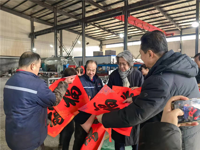 小分队在企业参观学习 中国美协副主席、市美协主席王书平为活动创作了雄鹰图。李毅峰、张福有、史振岭、张运河、陈钢、翟鸿涛、刘学峰等画家,把美好的祝福融入笔墨,精心绘制出一幅幅寓意吉祥的画作,写下迎新纳福的“福字”和春联。领到“福”字、春联的村民、企业职工喜笑颜开,活动现场,翰墨飘香,气氛热烈,年味十足。