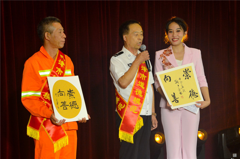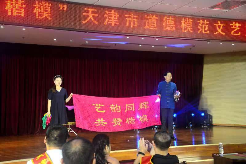 由天津市杂技家协会选派、国家级非遗传承人肖桂森表演的古典戏法《共赞楷模》引人入胜,由武清区曲艺家协会创作、武清区文艺工作者王振超表演的评书《运河大义》更是将一位在凛冽寒冬里勇救落水儿童的花甲老人,在危难时刻挺身而出的无名英雄的形象展现得具体生动。