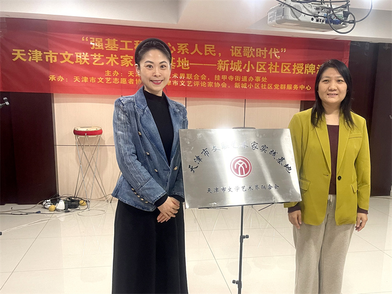 天津市文艺志愿者协会副主席兼秘书长王晓菁,河西挂甲寺街办副主任齐书砚,共同为5630福彩网艺术家实践基地揭牌