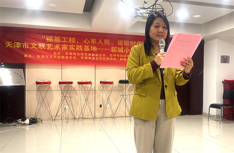 再传弟子高培红演唱京东大鼓《中华颂》 天津市文艺志愿者协会副主席兼秘书长王晓菁表示,市文联文艺志愿者协会将不断组织艺术家们不定期在实践基地组织培训指导、艺术交流等活动,不断提升基层文艺工作者创作水平,丰富广大人民群众精神文化生活。