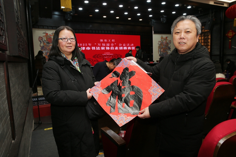1月13日天津市书法家协会举办的“强基工程”——2025年“万福迎春”公益活动,在传统文化底蕴深厚的中国年画之乡西青区杨柳青古镇火热举行。中国书协副主席、市书协主席张建会,市书协副主席、秘书长杨健君,市书协原副主席李锋、邵佩英,市书协副主席郝军、吕铁元、邢纪庆、杨国欣,市书协副秘书长薛卫林,市书协理事李翌、刘磊等11名书法家参与活动;中共西青区委常委、宣传部部长董玉倩,西青区文旅局党组书记、局长杨万松,西青区杨柳青镇党委副书记、镇长高庆锡,西青区委宣传部副部长、区文明办主任李峥,西青区文联专职副主席高应年等也参加了活动。