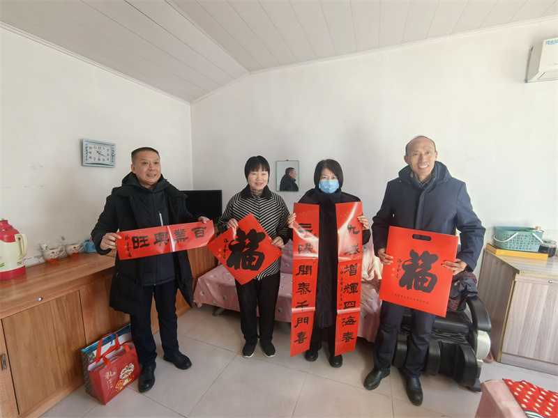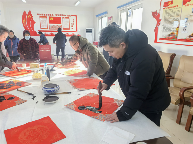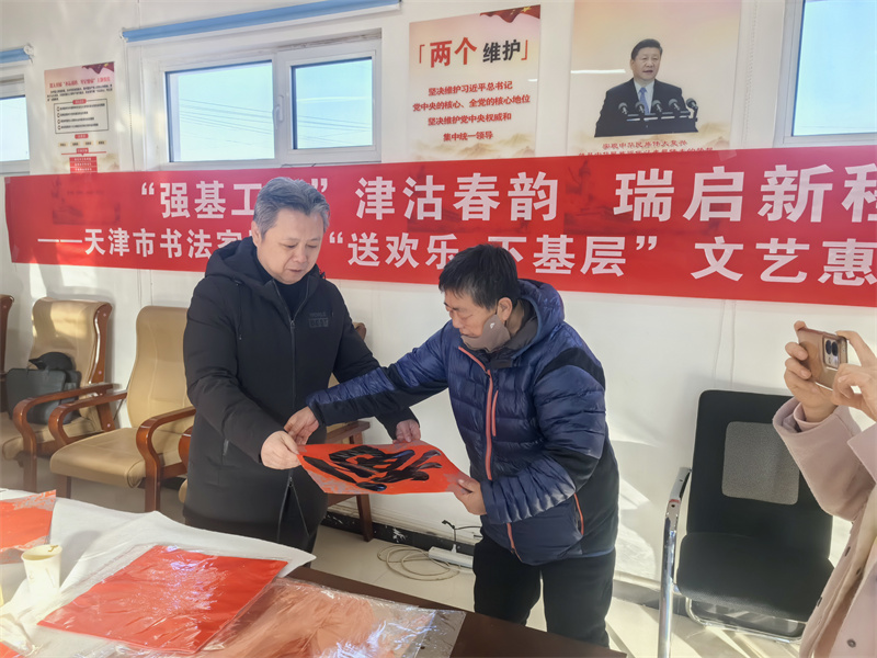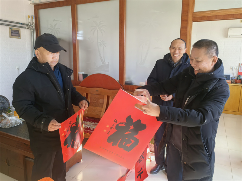 1月15日,市文联党组成员、二级巡视员刘志勇带领天津市书法家协会文艺惠民服务小分队,到宝坻区林亭口镇林亭口六村开展慰问服务活动,看望市文联驻村干部,为村民送去慰问品,并现场书写春联和福字。活动现场气氛热烈,墨香四溢。市书协副主席、秘书长杨建军,市书协副主席杨国欣,市书协副秘书长薛卫林,市书协隶书委员会副主任马俊达等书法家挥毫泼墨,将对村民的新年祝福融入一幅幅精美的春联和福字中。
