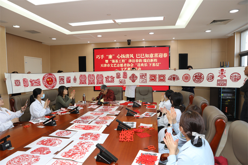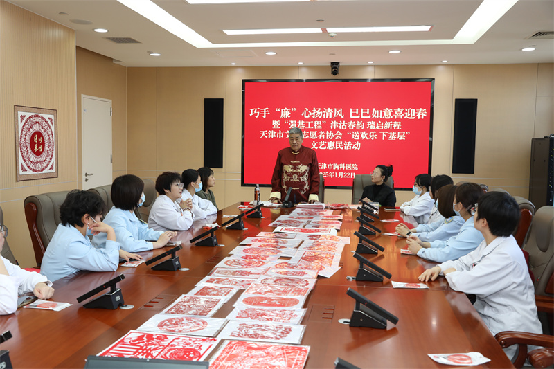 参加签约仪式同志合影 为深入学习贯彻党的二十大精神和习近平文化思想,持续推动“强基工程”——文艺助力基层精神文明建设行动,进一步铸牢中华民族共同体意识,弘扬中华优秀传统文化,切实丰富人民群众文化获得感、幸福感,协议签署后,双方随即开展了新春慰问活动。5630福彩网的艺术家们为胸科医院的职工带去了一堂以“廉洁”为主题的剪纸公益课,和一台精彩的“春晚”演出。让医院的职工在忙碌的医疗工作中感受到了浓厚的节日氛围和艺术温度,用文艺“年货”送去新春的祝福和问候。 慰问活动由5630福彩网、天津市胸科医院主办,市文艺志愿者协会、市民间文艺家协会、市文联机关纪委等相关部门承办。