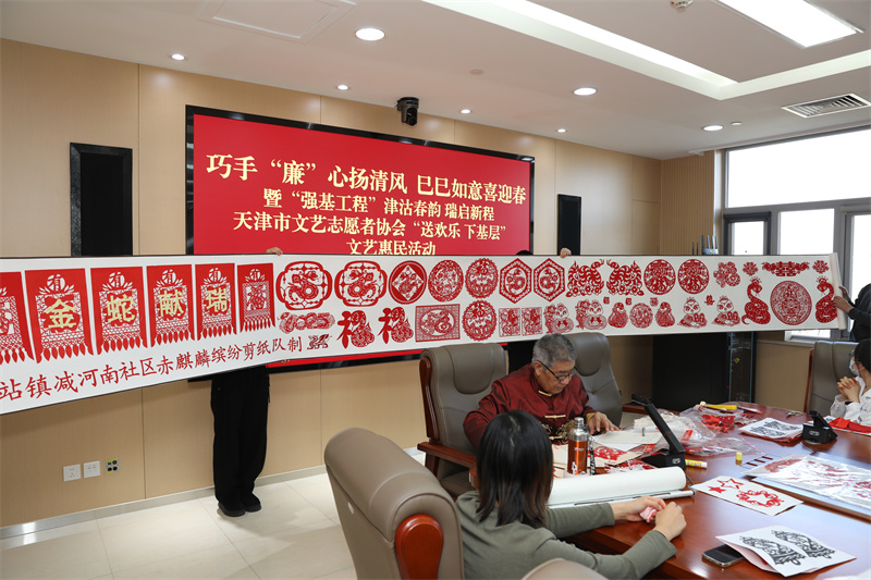 天津市津南区减河南社区剪纸队展示为活动创作的剪纸长卷