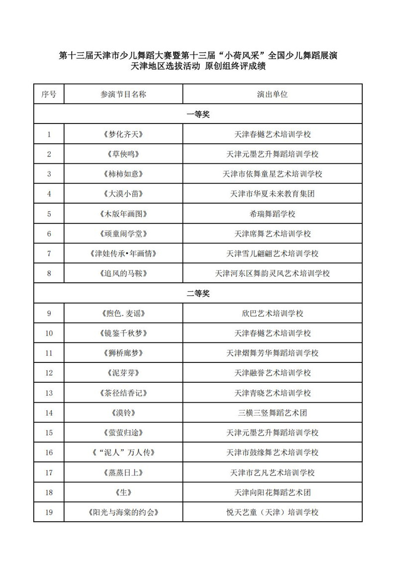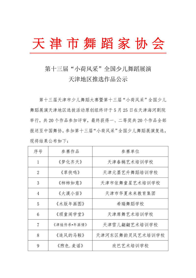 第十三届“小荷风采”全国少儿舞蹈展演天津地区推选作品公示以及原创组获奖成绩公布