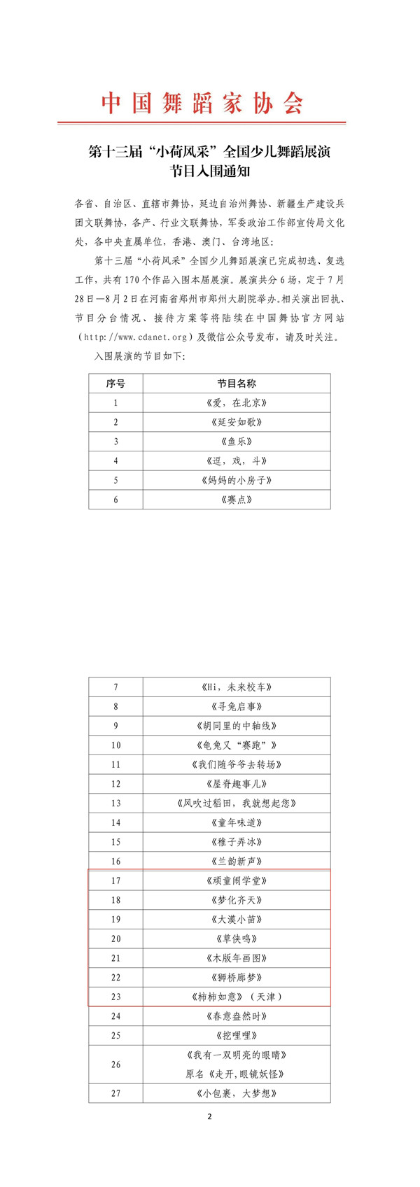 近日,第十三届“小荷风采”全国少儿舞蹈展演完成初选和复选工作,天津市舞蹈家协会推送的《顽童闹学堂》《梦化齐天》《大漠小苗》《草侠鸣》《木版年画图》《狮桥廊梦》《柿柿如意》共7部少儿舞蹈作品脱颖而出,成功入围全国展演。 ![]() “小荷风采”全国少儿舞蹈展演经中宣部批准立项,由中国文联、中国舞蹈家协会主办,是全国具有最高导向性、示范性和权威性的少儿舞蹈艺术活动品牌。本届展演将于2025年7月28日-8月2日在河南省郑州市郑州大剧院举行。