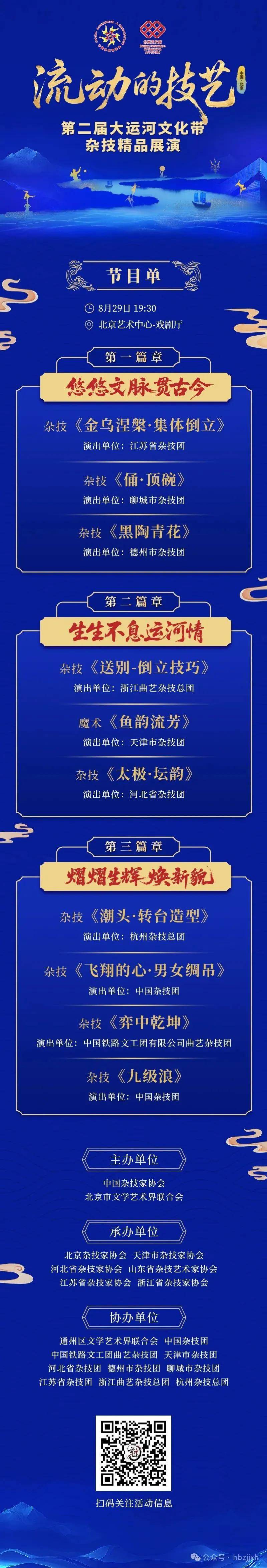 8月29日,第二届“流动的技艺”大运河文化带杂技精品展演将在北京艺术中心·戏剧厅隆重举行。来自北京、天津、河北、山东、江苏、浙江杂技家协会的九大顶尖院团将带来优秀节目参加展演,欢迎广大会员和杂技爱好者到场观看!