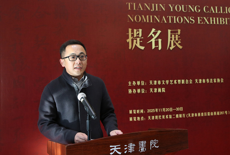 赵华在讲话中指出,市文联党组积极践行习近平总书记视察天津时提出的“四个以文”重要要求,在推动文化传承发展上善作善成,本次提名展充分体现了天津青年书法家的责任担当与艺术才情。这是多年来天津市书协加强青年书法人才培养的成果结晶,也是市文联实施“宝塔工程”,夯实青年人才根基的生动实践。他希望新时代青年书法家要做文化传承的坚定守护者,时代创新的勇敢开拓者和德艺双馨的自觉践行者,要以此次展览为契机,坚守文化自信,永葆创作激情,用手中的笔墨传承中华文脉,描绘时代风采,为谱写中国式现代化天津篇章贡献文艺力量!
