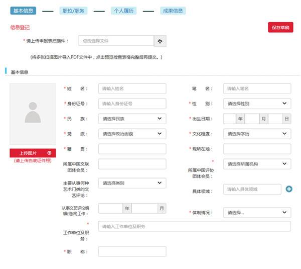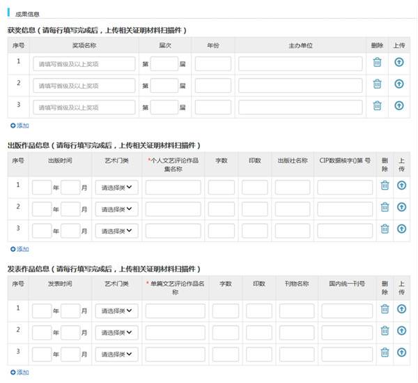 ![]() 3. 请在成果信息处上传相关证明材料清晰扫描件,保证内容可读。要求如下: (1)获奖信息:请上传省级以上文艺奖项获奖证书扫描件; (2)出版作品:请对照申请条件上传出版作品的封面、版权页、目录页及内文主要页面扫描件。申报作品均须经中国版本图书馆查询核实为国家合法出版物,自费或合作出书情况,应作出说明,以供参考,非法出版物为无效材料; (3)发表作品:请对照申请条件提供在全国公开发行期刊或报纸上发表的作品。请上传作品发表当期刊物封面(或当日报纸版头)、目录页及作品页扫描件;网络文艺评论作品请上传首页的网页截图,须含网站名称或网址、发表时间、作品阅读量,网络发表作品须符合《著作权法》和相关法律法规; (4)职称证书:请上传相应职称证书;各全国文艺家协会会员证;全国文艺评论方面的研修培训结业证;申请者所在单位出具的关于申请者文艺评论工作年限满足入会条件的证明;统战部门出具的无党派人士证明等材料扫描件; (5)身份证:请上传身份证件正反面扫描件; 4. 系统填写完成后点击“下载申请表”导出并打印,在打印的申请表上依次完成本人签字、本人所在单位签署意见并盖章、推荐单位签署意见并盖章或推荐人签署意见并签字,三者缺一不可,否则视为申请手续不全不予审批; 5. 请将盖章、签字手续齐备的申请表扫描件上传至系统; 6. 经检查所有信息填写完整无误,入会申请表、获奖证书、出版或发表作品材料、职称证书、身份证件等扫描件均上传后,点击“提交”; 7. 提交成功后将显示“已提交到中国评协,等待审核!”,请申请者耐心等待; 8. 中国文艺评论家协会按照程序严格组织评审,并将新会员名单适时在中国文艺评论网和中国文艺评论微信公众号上发布; 9. 中国文艺评论家协会发放的新会员通知,将由各省级评协通知到该地区的全部新会员,待收齐会费后,中国评协将为该地区会员统一办理会员证,并由各省级评协代为寄送至会员本人;中央和国家机关单位的新会员,由中国评协秘书处直接联系办理; 10. 在成为新会员后,如个人信息有变更,请及时主动告知中国评协和所在地区省级评协。信息变更涉及会员本人权益,特别是电话号码、通讯地址、邮编、单位及职务职称等信息变动较为常见,请及时联系更新。 四、其他有关事项 所填报信息及申报作品须真实有效,有弄虚作假、抄袭、剽窃行为的申请者,中国文艺评论家协会将取消其五年内的申请资格; 本办法仅适用于内地申请者,香港、澳门、台湾地区及海外申请者另作规定; 成为正式会员需按时交纳会费,我会会费标准为每年120元。 五、联系方式 (请于周一至周五工作日、工作时间拨打,上午9:00—11:00,下午2:30—4:30。) 入会申报系统技术支持咨询电话: 010-64920183 中国文艺评论家协会秘书处联系电话: 010-59759456