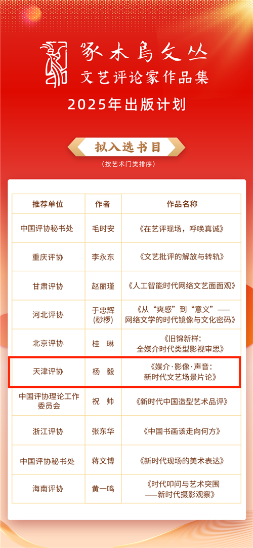 近日,由中国文艺评论家协会、中国文联文艺评论中心、中国文联出版社联合举办的2025年《啄木鸟文丛——文艺评论家作品集》出版计划入选作品公示,由天津评协推荐的杨毅的《媒介·影像·声音:新时代文艺场景片论》书稿入选。 为深入学习贯彻落实习近平文化思想,持续展现新时代新场景的文艺评论风貌,推出文艺评论人才和作品,经中国文联批准,中国文艺评论家协会、中国文联文艺评论中心、中国文联出版社联合启动2025啄木鸟文丛出版计划。经中国评协各团体会员和专业委员会积极推荐,中国评协会员踊跃申报,汇集了一批申报作品。评审秉持“优中选精、宁缺毋滥”原则,坚守主流价值导向,聚焦新时代文艺场景,对申报作品进行了严格规范的资格审查、专家评审和会议研究并公示,有10部作品拟纳入2025年度出版计划。