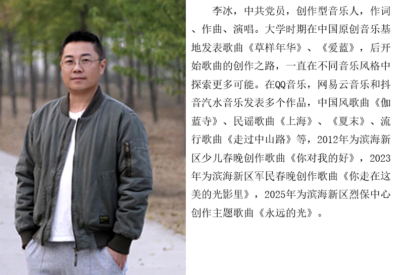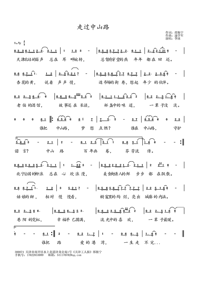 为深入学习贯彻习近平新时代中国特色社会主义思想和党的二十大、二十届四中全会精神,落实习近平总书记视察天津重要讲话精神,坚持以人民为中心的创作导向,以纪念世界反法西斯战争胜利80周年、庆祝中华人民共和国成立76周年为契机,以文化人、以文惠民、以文润城、以文兴业,展现城市文化特色和精神气质,大力繁荣音乐创作,培养、扶持优秀青年词曲作家队伍,2025年度天津市音乐家协会面向全市征集、推选出十首思想精深、艺术精湛、制作精良的精品歌曲,现进行线上展播。 1.歌曲《走过中山路》 作词:邵衡宁 作曲:逯学军 演唱:李冰