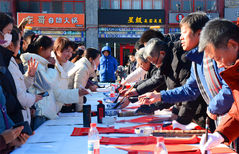 福暖新春,字寄深情。“福”是新春佳节最真挚的美好祝愿,贴福字、纳福运,寄托着人们对美好生活的热切向往。演出开始前,蓟州影剧院广场上,热烈欢腾的《渔阳花鼓》已然奏响,长桌旁早早围满了前来“求福”的群众。由市文联副主席、市书协副主席杨健君带队,天津市书协与蓟州区书协的书法家们现场挥毫泼墨、笔走龙蛇,将一幅幅墨香浓郁的福字、一副副寓意吉祥的春联,亲手赠送给现场群众,把新春的美好祝福送到百姓手中。